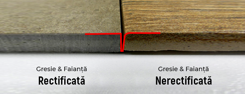 Când așezăm o placă rectificată lângă alta putem aprecia marginea precisă, curată și uniformă. Datorită acestui lucru putem așeza plăcile mult mai aproape una de cealaltă pentru a crea rosturi mai fine și mai curate.